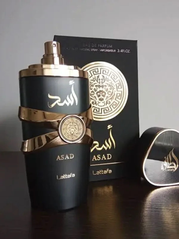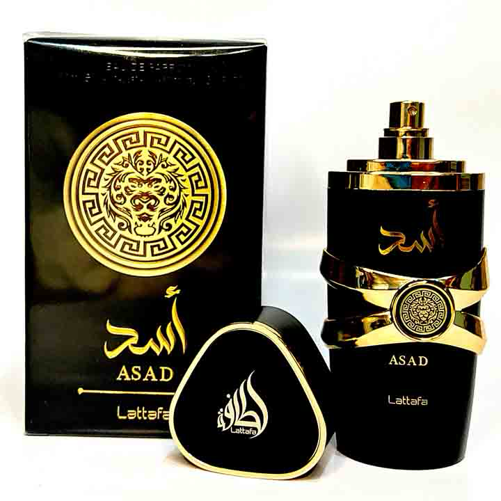 اسد یه جعبه خیلی خوب دارد که روش یه مارک از شیر میبینید و پشت جعبه هولوگرام شرکت لطافه حک شده است . و اما شیشه اسد که یه شیشه مشکی رنگ هست که دورش یه قاب طلایی رنگ که به زیبایی هر چه تمام و به ظرافت خاصی دور ادکلن قرار گرفته