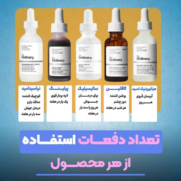 چندبار؟؟ هر سرم رو چطور استفاده کنم؟؟چند بار در هفته؟؟؟ نیاسینامید؛روش نوشته روزی دوبار ولی ما میگیم هفته ای ۴بار پیلینگ؛ پوستت چربه میتونی تا هفته ای ۲بار پوستت خشکه هفته ای یکبار سالیسیلیک اسید؛ هفته ای ۳بار کافئین؛ هر شب هیالورونیک اسید؛ هرروز،روزی دوبار راستی تمام این سرم هارو میتونی با (ق.ی.م.ت) استثنائی از آسوکالا بخری