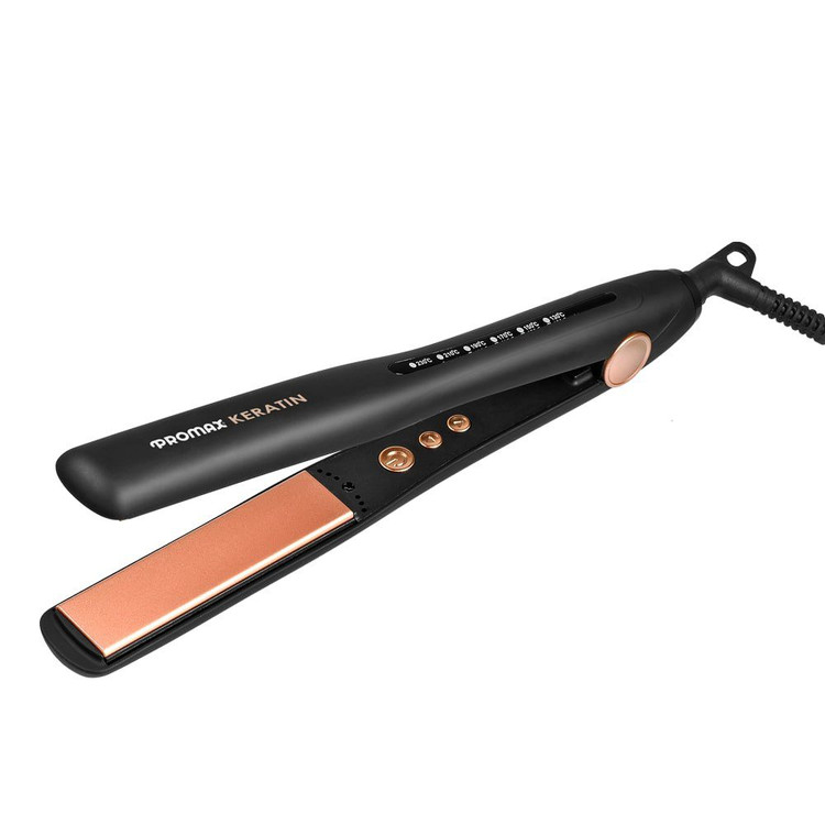 اتو مو پرومکس مدل 5757K با توان 55 وات دارای صفحات عریض و با کیفیت از جنس سرامیک با روکش کراتین می باشد که مناسب استفاده در سالن های آرایشی و یا مصارف شخصی بوده و به شما این امکان را می دهد تا با صرف زمان کم، موهای خود را به راحتی صاف نمایید. صفحات به رنگ رزگلد و بسیار زیبا هستند. درضمن روکش مخصوص روی این صفحات با القای کراتین به سطح و ساقه مو با مراقبت بیشتری آن ها را صاف کرده و کوتیکول مو را به خوبی پوشش می دهد.