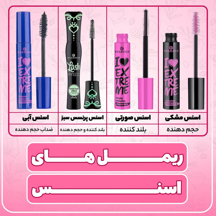 ریمل های اسنس همین اول کاری بگم به مناسبت عید رو همه ریمل ها (ت.خ.ف.ف) خفن زدیم هزاران ریمل اومد و رفت اما این اسنس هنوز جز بهترین هاست و نمیخواد بازنشست بشه نه یک مدل بلکه تمام مدل هاش محبوبن حالا بیا بهت بگم اسنس ها اصلا چه فرقی دارن مدل سبز و مشکیش(لش پرنسس): هم بلند میکنه و هم حجم میده ریمل اسنس صورتی که محبوبترینه؛ بیشتر روی بلند کردن مژه مانور میده ریمل اسنس مشکی؛ حجم دهندگی زیادی داره اگه مژه هات کمه اما بلند ایشونو تهیه کن و در اخر ریمل ابی: این ریمل دقیقا شبیه به ریمل مشکی اسنس با این تفاوت که ضد آبه هر سوالی دارین درخدمتم ۰۹۱۲۹۰۵۷۷۵۱