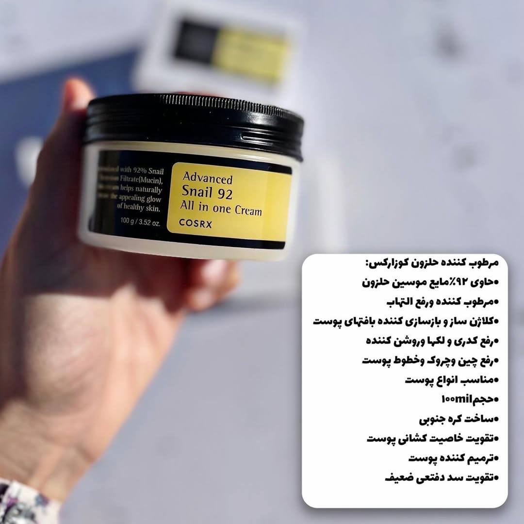 اسنس كوزاركس : بافت سرمى داره حاوى ۹۶درصد موسين حلزونه و خاصيت جوانسازى و رفع لك و ترميم كنندكى داره و بعدش خصوصا اكَه پوستتون خشك باشه احتياج به مرطوب كننده داريد و حتما روى پوست نم دار بزنيد !! ساخت:کره كرم مرطوب كننده كوزاركس: حاوى ٩٢درصد موسين حلزونه به رفع التهاب,چین و چروک كمك ميكنه و كلاژن سازه و خاصيت مرطوب كنندكى داره. ساخت:کره #اسنس_حلزون#مرطوب_کننده_حلزون#ابرسان