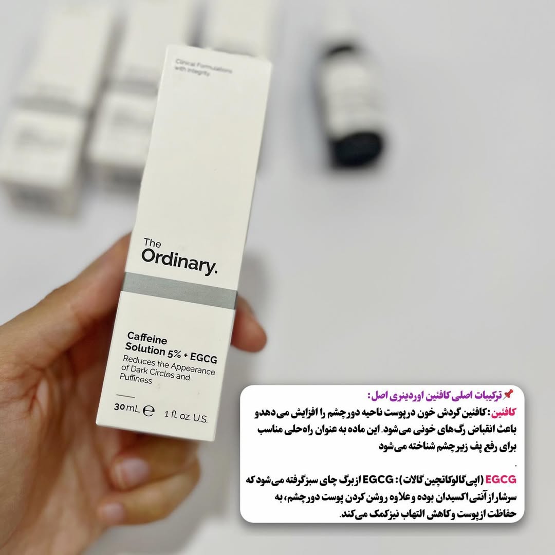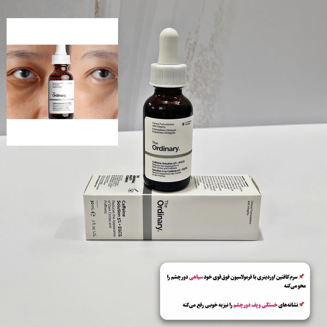 سرم کافئین اوردینری با فرمولاسیون فوققوی خود سیاهی دور چشم را محو میکنه نشانههای خستگی و پف دور چشم را نیز به خوبی رفع میکنه این سرم میزان گردش خون در اطراف چشم را افزایش داده و پوست این ناحیه را شاداب میکنه. ویژگی و خواص سرم کافئین اوردینری اصل: •از بین بردن تیرگیهای زیر چشم •رفع پف دور چشم •محافظت تمام عیار از پوست ناحیه زیر چشم •ترمیم و بازسازی بافت پوست زیر چشم •روشن کردن پوست زیر چشم •افزایش گردن خون در پوست زیر چشم •بافت سبک و جذب سریع •حاوی کافئین با غلظت بالای 5 درصد •ضد التهاب دور چشم •افزایش شفافیت و درخشندگی ناحیه دور چشم •دارای خاصیت آنتیاکسیدان قوی •یکدست کننده رنگ پوست اطراف چشم •مناسب برای تمام افراد با هر نوع پوستی •فرمولاسیون بر پایه آب •فاقد هر گونه ماده مضری مانند پارابن، الکل، گلوتن و سولفات 100% وگان و بدون تست روی حیوانات ترکیبات اصلی کافئین اوردینری اصل: کافئین: کافئین گردش خون در پوست ناحیه دور چشم را افزایش میدهدو باعث انقباض رگهای خونی میشود. این ماده به عنوان راهحلی مناسب برای رفع پف زیر چشم شناخته میشود. EGCG (اپیگالوکاتچین گالات): EGCG از برگ چای سبز گرفته میشود که سرشار از آنتیاکسیدان بوده و علاوه روشن کردن پوست دور چشم، به حفاظت از پوست و کاهش التهاب نیز کمک میکند. ساخت:کانادا اورجینال با ضمانت بازگشت کالا