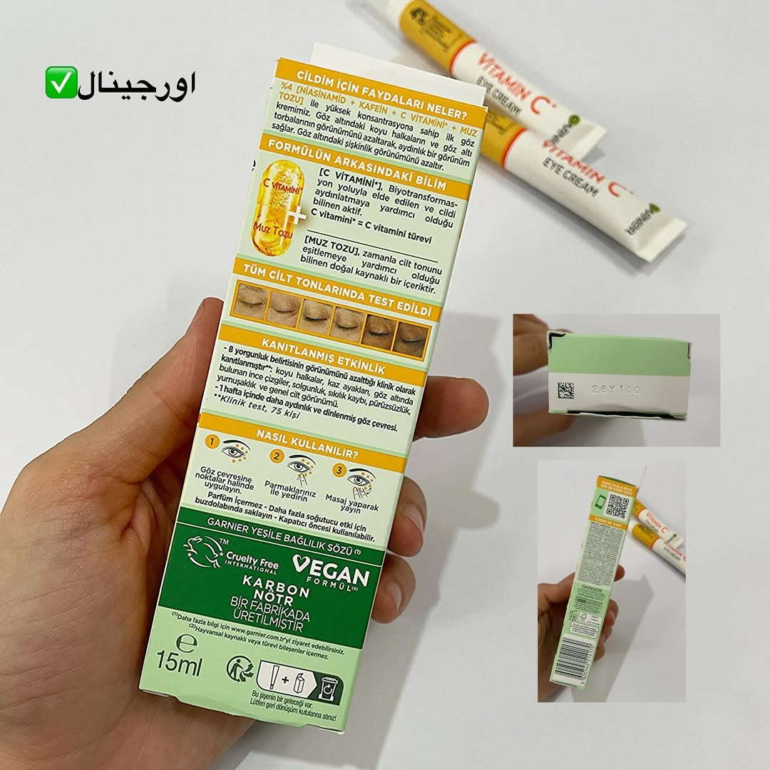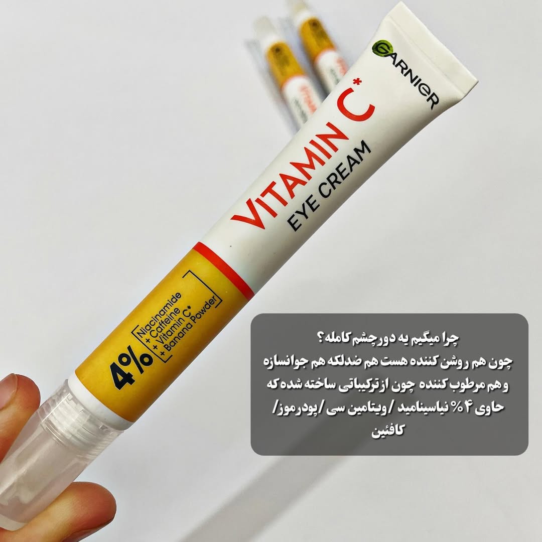 کرم دور چشم روشن کننده گارنیر: دورچشم همه کاره گارنیر،چرا میگیم یه دور چشم کامله؟ چون هم روشن کننده هست هم ضدلکه هم جوانسازه و هم مرطوب کننده چون از ترکیباتی ساخته شده که حاوی ۴٪ نیاسینامید /ویتامین سی/پودر موز/کافئین مشخصات کرم دورچشم ویتامین سی گارنیر: •حاوی ویتامین سی، نیاسینامید، کافئین، پودر موز، رفع چین وچروک وتیرگی و پف دور چشم، آبرسان بسیار خوبی همبرا پوست دور چشم هست. •کاهش دهنده تیرگی •کاهش دهنده پف •فاقد تست حیوانی •دارای اثرات تقویت کنندگی پوست •مناسب انواع پوست •حاوی ویتامین سی •محافظت کننده از بافت دور چشمی •حاوی کافئین •یکدست کننده بافت دور چشمی •فاقد عطر و پارابن •حاوی نیاسینامید + کافئین + ویتامین سی + پودر موز •مورد تایید متخصصان پوستی •روشن کننده دور چشم •دارای اثرات جوانسازی •رفع کننده خستگی و رنگ پریدگی دور چشم •حجم ساخت: المان اورجینال دارای ضمانت اصالت کالا درصورت تشخیص فیک بودن محصول میتونید محصول وبرگشت بزنید. #کرم_دورچشم#دورچشم_گارنیر#دورچشم_گارنیه#گارنیر#گارنیه