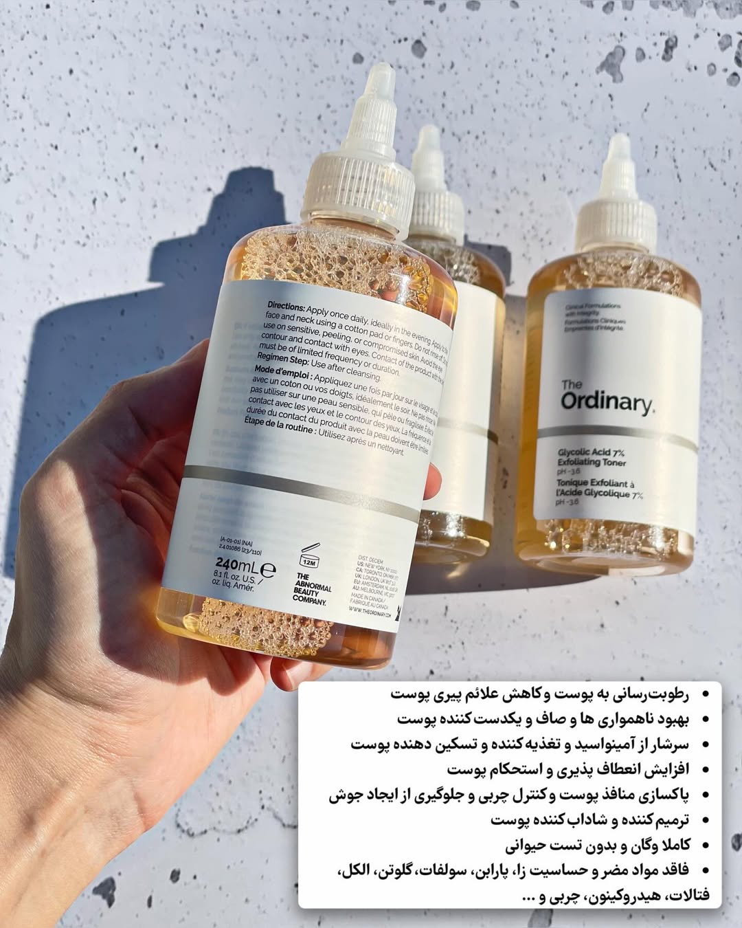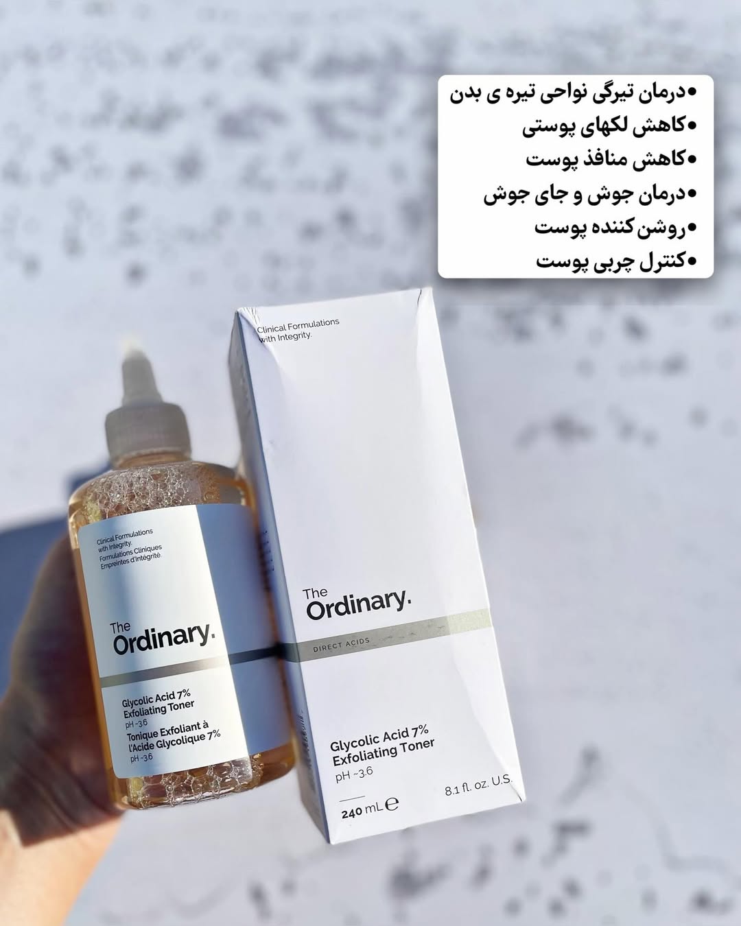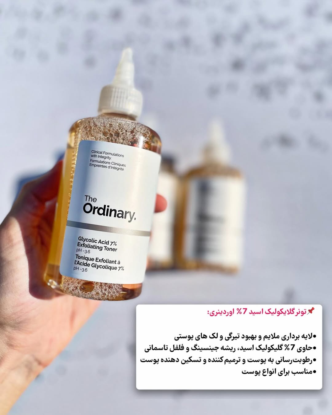 تونر لایه بردار و روشن کننده گلیکولیک اسید اوردینری یکی از بهترین تونرهای لایه بردار باPH تقریبا ست که سبب برگرداندن PH پوست به حالت طبیعی شده و همچنین پوست را آبرسانی و هیدراته می کند. تونر گلیکولیک اسید هفت درصد اردینری: منافذ پوست را به طور کامل پاکسازی کرده و چربی اضافه پوست را نیز کنترل می کند و از این رو از ایجاد جوش و آکنه نیز جلوگیری می نماید و پوست را نرم و شاداب می کند. مشخصات تونر گلایکولیک اسید 7% اوردینری: • لایه برداری ملایم و کاهش تیرگی و لک های پوستی • حاوی 7% گلیکولیک اسید، ریشه جینسینگ و فلفل تاسمانی • روشن کننده و شفاف کننده پوست • رطوبترسانی به پوست و کاهش علائم پیری پوست • بهبود ناهمواری ها و صاف و یکدست کننده پوست • سرشار از آمینواسید و تغذیه کننده و تسکین دهنده پوست • افزایش انعطاف پذیری و استحکام پوست • پاکسازی منافذ پوست و کنترل چربی و جلوگیری از ایجاد جوش • ترمیم کننده و شاداب کننده پوست • کاملا وگان و بدون تست حیوانی • فاقد مواد مضر و حساسیت زا، پارابن، سولفات، گلوتن، الکل، فتالات، هیدروکینون، چربی و • مناسب برای انواع پوست اصلی ترین ترکیب در این تونر، گلیکولیک اسید به میزان 7% است که نوعی آلفا هیدروکسی اسید بوده و با لایه برداری و حذف سلول های مرده پوست باعث روشن شدن و کاهش لک ها و خطوط ریز پوست شده و همچنین موجب رطوبت رسانی و نرم شدن پوست می شود. حجم:۲۴۰ ساخت: کانادا مناسب برای انواع پوست #تونر_اوردینری#اوردینری#تونر_گلایکولیک_اسید